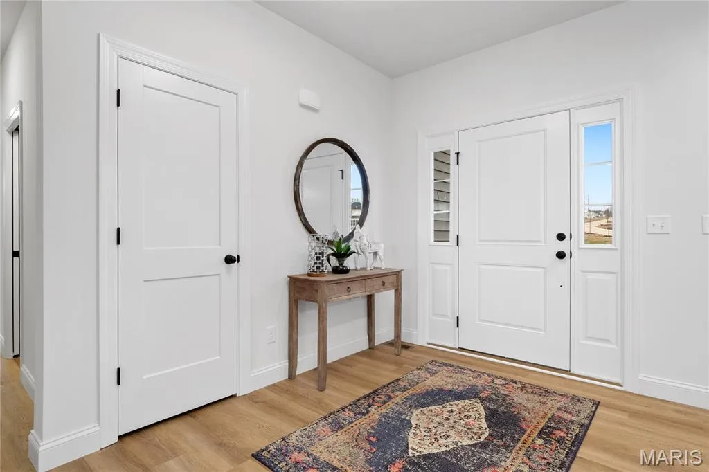 This 1.5-story Bridgeport home in Prairie Bluff offers 3,204 sq. ft. of living space with 4 bedrooms, 3.5 baths, and a 3-car garage. The kitchen includes quartz countertops, 42” staggered cabinets with crown molding, soft-close drawers with dovetail construction, glass front accents, stainless steel gas appliances, pendant lighting, and a refrigerator cabinet. The family room features laminate flooring, a gas fireplace, recessed lighting, and wiring and bracing for a ceiling fan. The main-floor primary suite has 10’ ceilings, recessed lighting, and an attached bath with a double vanity, wave bowl sinks, and hardware. Upstairs includes a bonus room and three bedrooms, each with bracing for ceiling fans. The home also offers main-floor laundry, and a walk-out basement with 8’ pour and rough-in bath. Located in Cottleville within the Francis Howell School District.