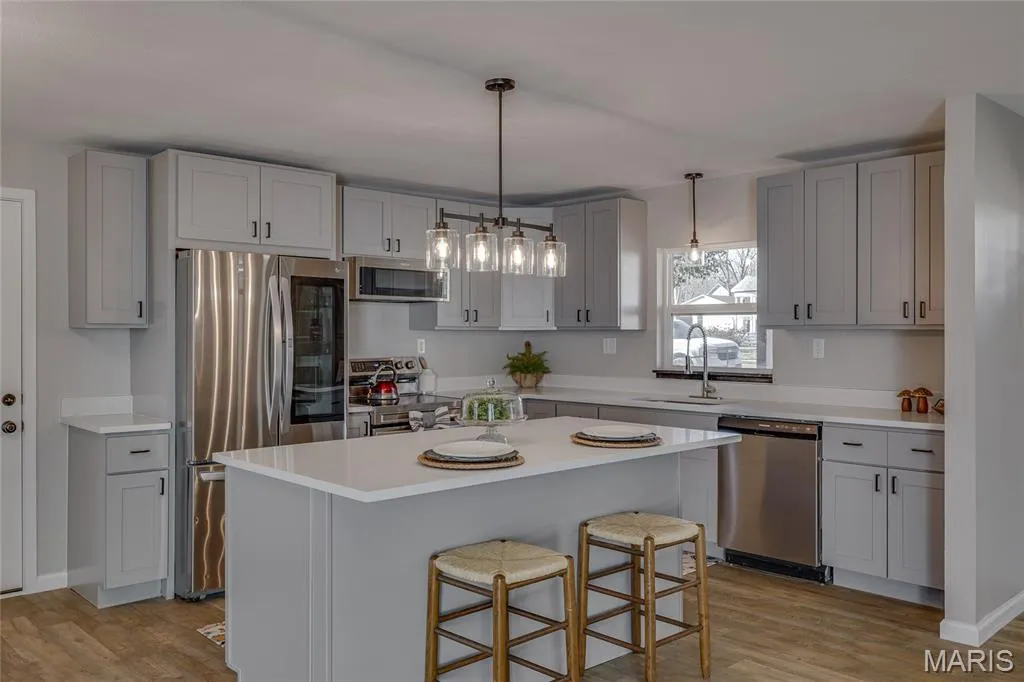 Features include an all-new open floor plan with brand-new kitchen, bathrooms, plumbing, electrical, flooring, roof, HVAC, stone front, garage door, and freshly poured driveway and back patio. Truly turnkey with no projects left to do.