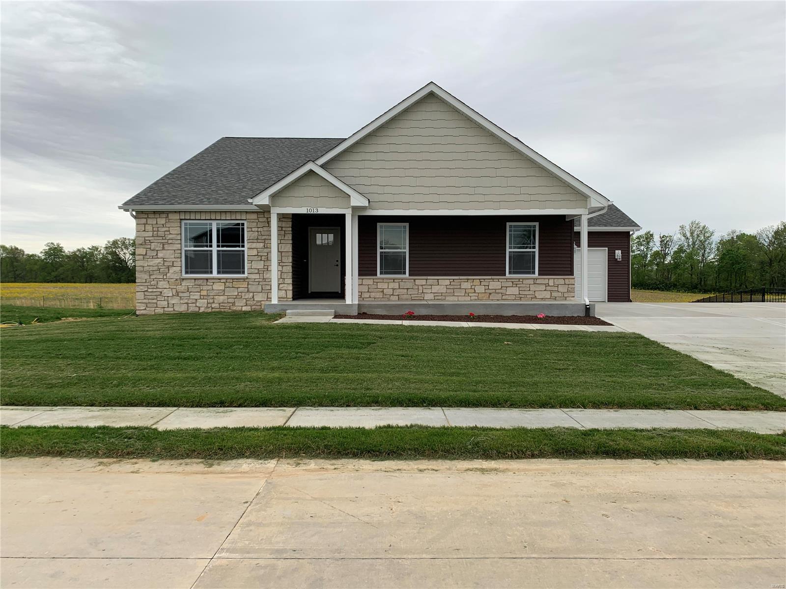 Beautiful new home in The Meadow Pines Estates Subdivision. One story home with a full basement. Main level features a large, open living space with vaulted ceilings. Large, tastefully designed kitchen with stone counters, and stainless steel appliances. Off of the living area is a spacious master suite with a large master bath and walk-in closet. There are two more bedrooms and another full bath located on the main level. When entering the home from the garage you walk in to a large mudroom that sits adjacent to the laundry room. Downstairs this home has a large unfinished basement with unlimited potential. Large 3 car garage. Home backs to a farm field which provides ample privacy. All of this in a pleasant country setting with the conveniences of the city a short drive away.